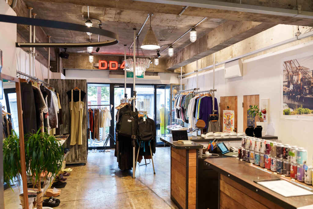 松山市中心部にあるアパレルショップ「DD4D」。セレクトした洋服や雑貨が並ぶ店内の奥には、ステンレスの大きなタンクが連なるクラフトビールの醸造所がある。代表の山之内さんは、県外や海外で10年以上暮らした後、家業を継ぐために松山に戻ったUターン移住者だ。「アパレル業を営んでいた父が病気を患ったのが帰郷のきっかけです。今後はアパレル業だけでは立ち行かなくなるだろうという予想もあり、せっかくなら家業を継ぐだけじゃなく、自分のやりたいことも形にしようと思いました」と、クラフトビール製造に至った理由を語る。